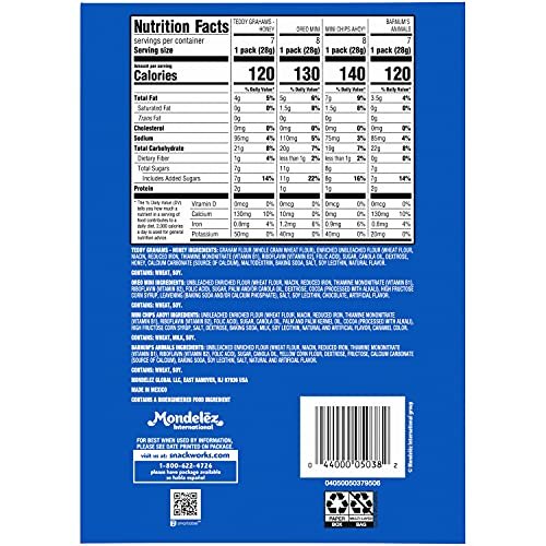 One 30 count Nabisco Team Favorites Snack Variety Pack, 8 OREO Mini, 8 CHIPS AHOY! Mini, 7 Teddy Grahams, 7 Honey & Barnum’s Animal Crackers (packaging may vary)